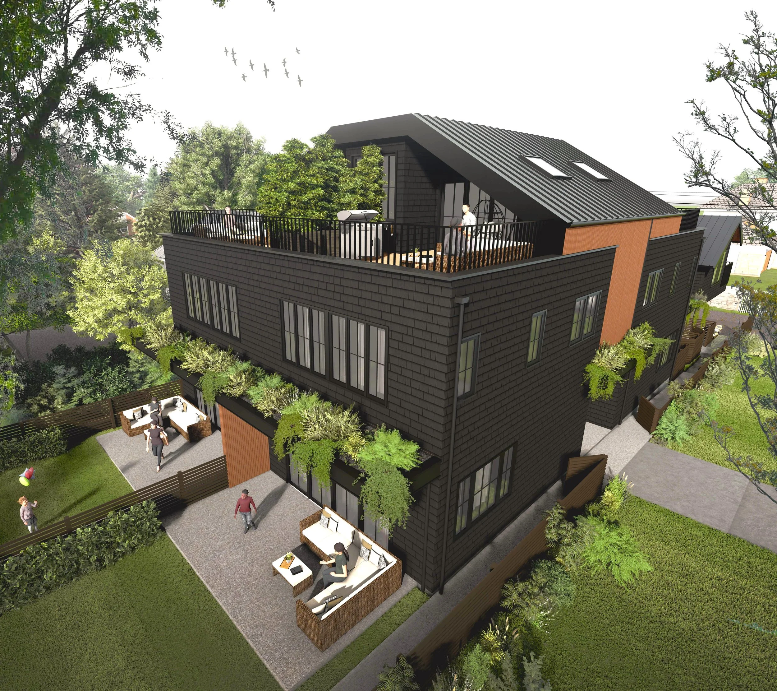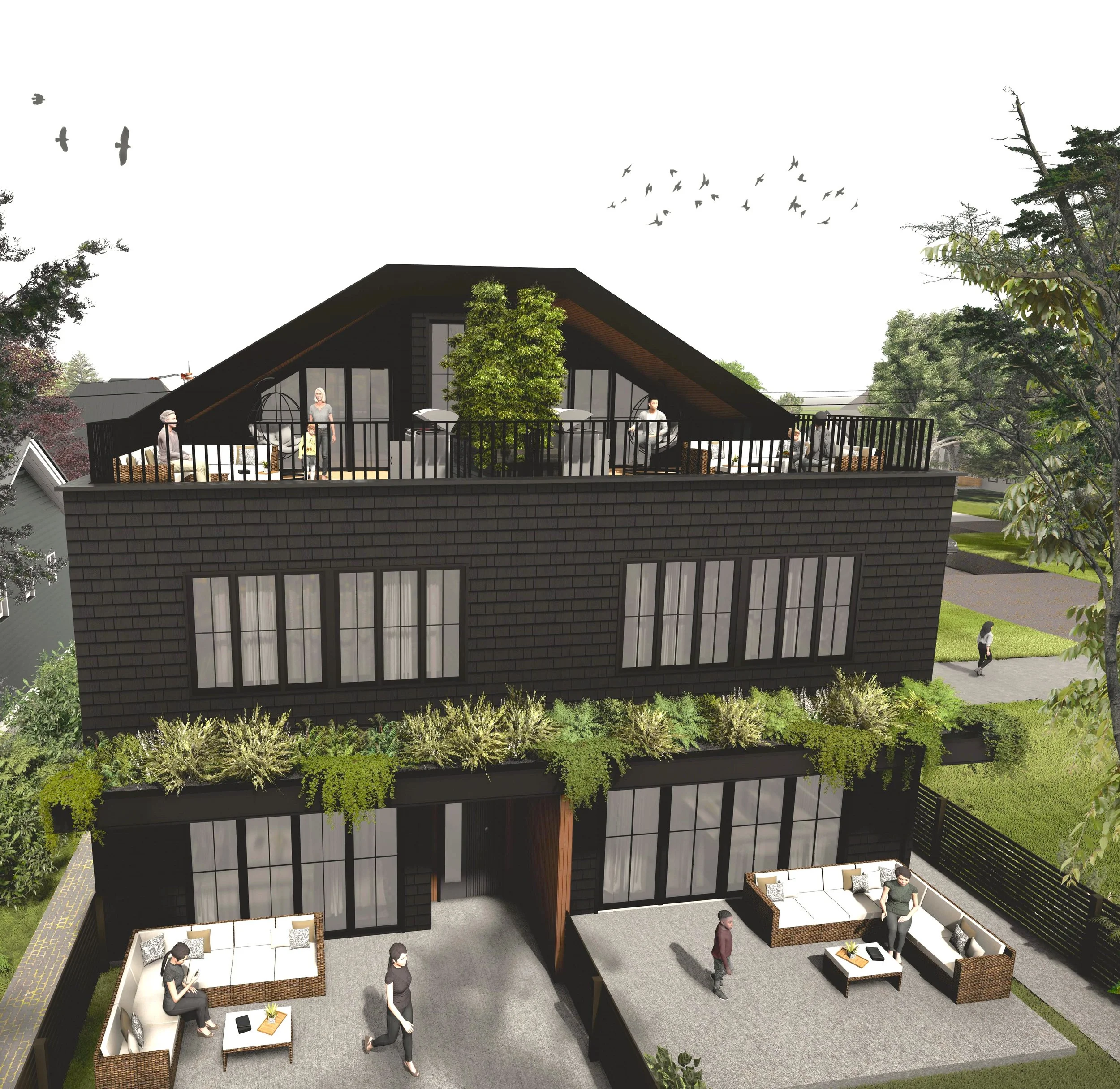 Durable metal roof, triple-pane aluminum clad windows, NewTechWood entryway and facade accents, and porcelain patio tiles are just some of the quality exterior details at Vine Street Residences.
